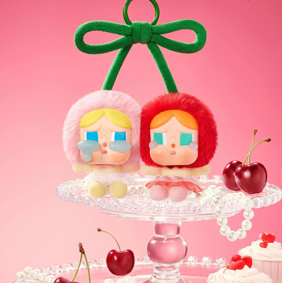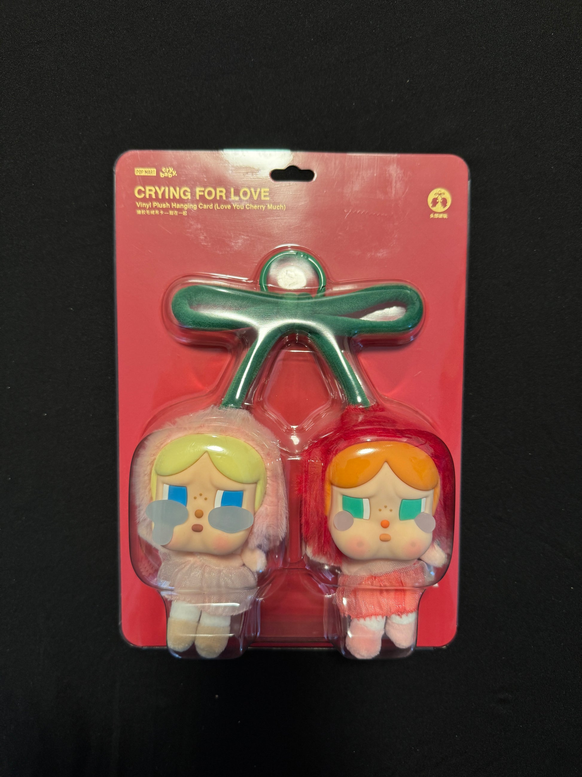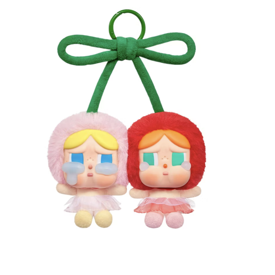 The Pop Mart CryBaby Crying For Love Series Love You Cherry Much Vinyl Plush Hanging Card features two CryBaby figures. Resembling two cherries, one CryBaby is in a soft pink hat and tulle skirt and the other in vibrant red. They are linked by a velvet green bow.