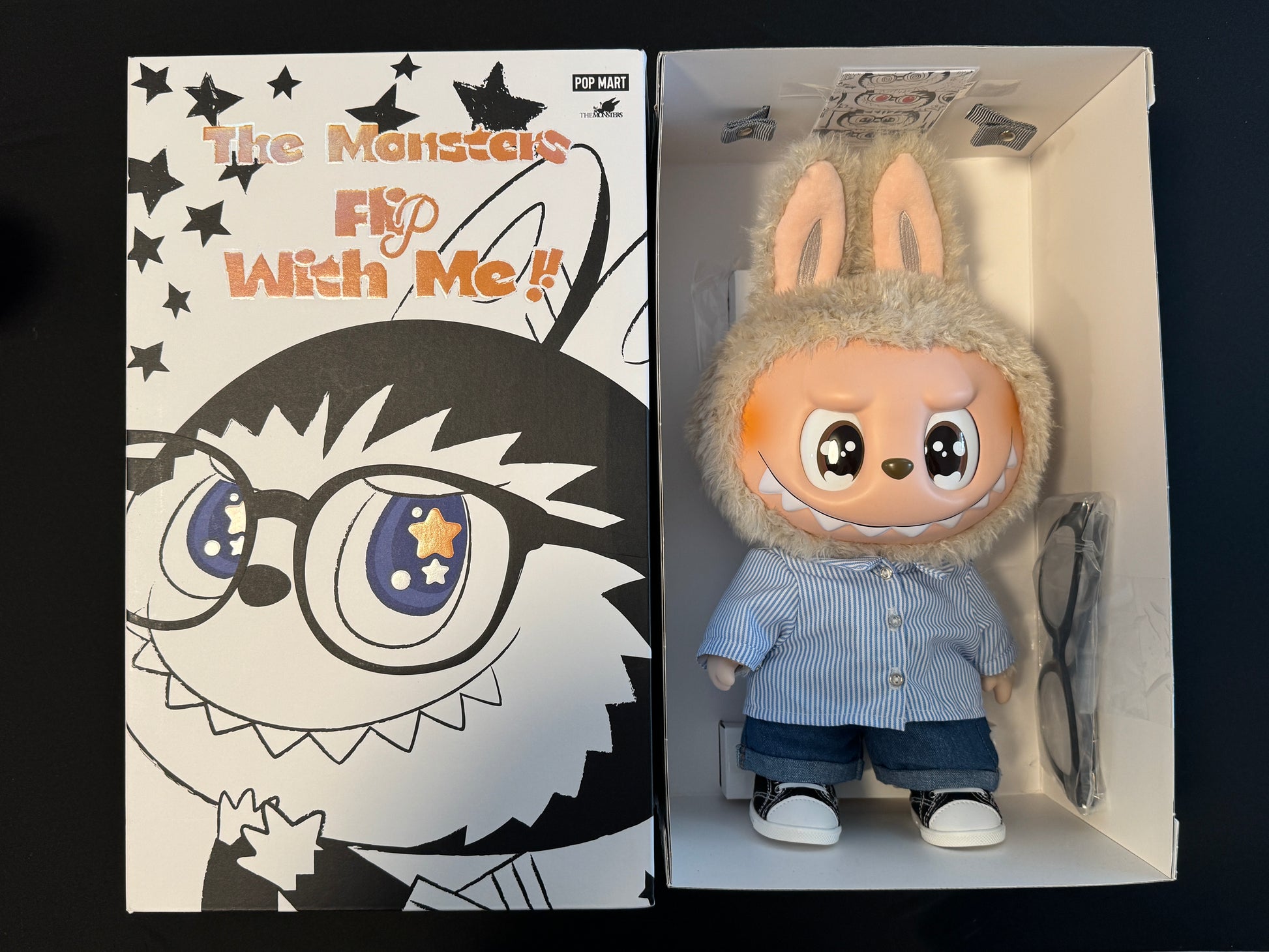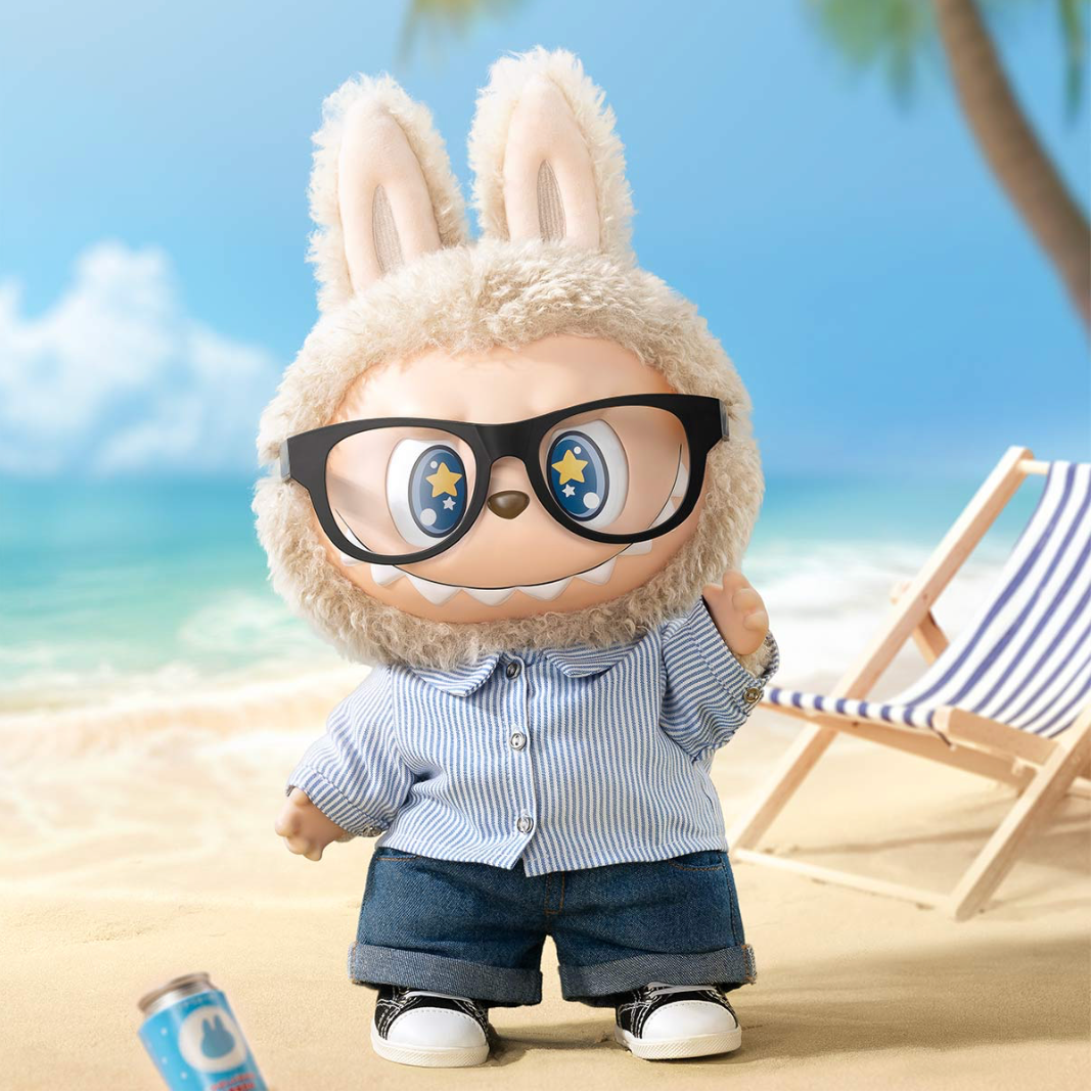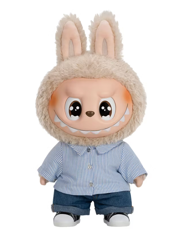 The Monsters Flip With Me Vinyl Plush Doll Pop Mart Labubu features a character wearing a blue and white striped collared button-down shirt, suitable for the office. The character also wears a pair of dark denim jeans and black and white sneakers. This character features a tan plush fur around its head and rabbit ears, with the vinyl face bearing large brown eyes and a toothy smile. The doll stands at almost 16 inches tall.