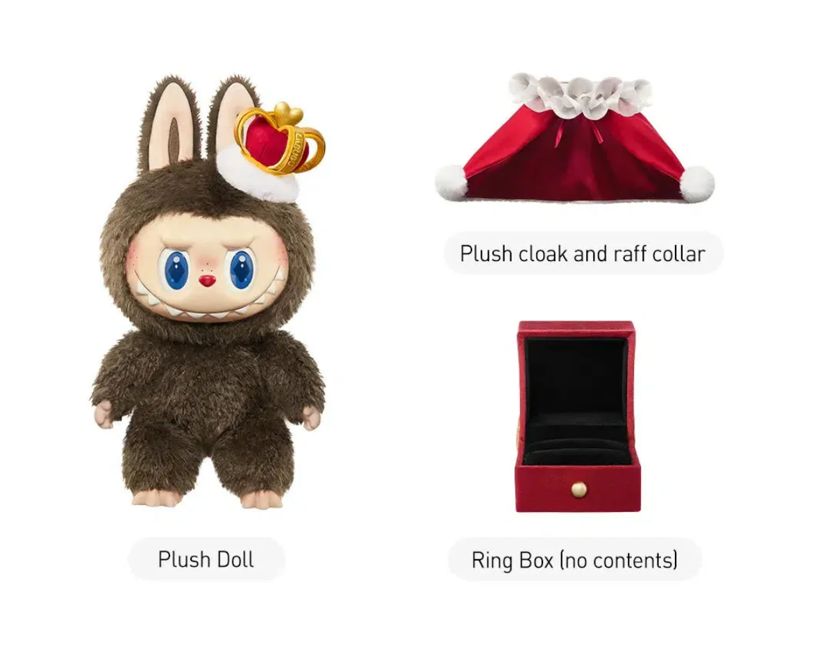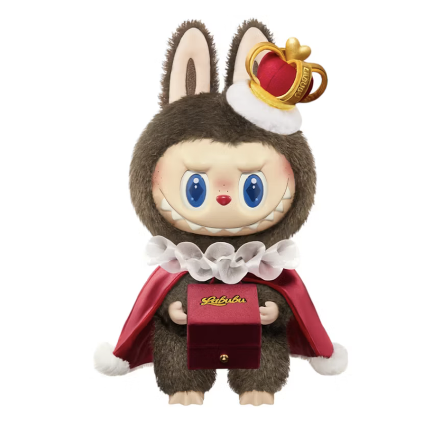 This iteration of Pop Mart's Labubu The Monsters Let's Checkmate Series Vinyl Plush Doll stands 14.57 inches tall and is made of vinyl and plush material. Labubu is wearing a red king‚ cape with white frills on the top and bottom, and wearing a lopsided red and gold crown in front of one ear. He holds a red box with Labubu written in cursive gold on top. Brown fur covers his body except for his face, hands, inside his ears, and feet. The character wears a mischievous expression with big blue eyes and a sharp-toothed smile.