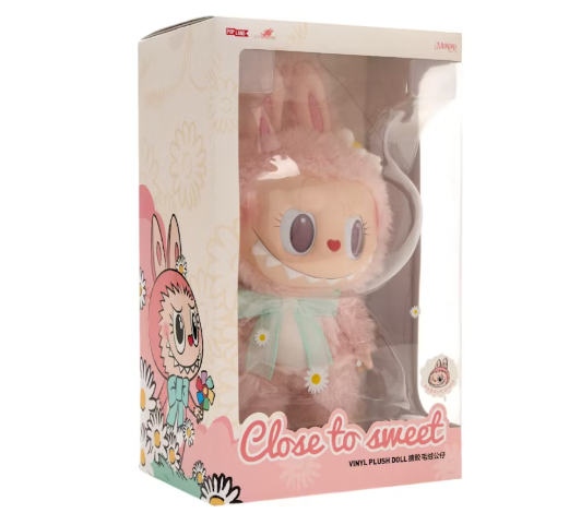 The Labubu series of the Pop Mart doll craze brings you Mokoko Close To Sweet, a toothy-grinned, naughty character with bunny-like features crafted from vinyl and plush. Standing almost 16 inches tall, it is primarily pastel pink, with two bunny ears protruding from its head and a big white bow around its neck. Beloved by collectors around the globe, the Labubu series produces limited-edition dolls that instantly become collectibles.